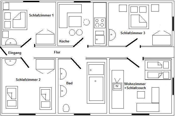 Unsere größte Wohnung verfügt über 3 schöne Schlafzimmer, einer Küche (Herd/Backofen/Geschirrspüler) mit Essecke, einem Bad mit Dusche/Badewanne/WC, einem freundlichen Wohnzimmer mit Sofa und Schlafsofa. Sie ist für 6 Personen mit Kindern, max. 8 Personen geeignet. Die Größe beträgt 78 m². Die Schlafzimmer sind alle mit separaten Waschplätzen ausgestattet. TV, Radio und Telefon-/Internetanschluss sind vorhanden.