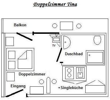 Unser kleines, gemütliches Doppelzimmer verfügt über ein Bad mit Dusche/WC, und einer Singleküche (2er Kochmulde, Kühlschrank, Spüle) mit Esstisch. Auf dem eigenen Balkon mit Sitzgelegenheit und großem Talblick kann man sich gut erholen. Die Größe beträgt 17m². TV, Radio und Telefon-/Internetanschluss sind vorhanden.