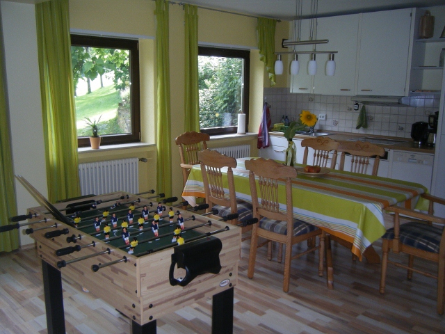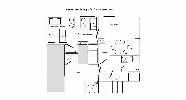 Einer Gruppe bis zu 8 (12) Personen bietet unsere schöne Wohnung Platz. Ein Schlafraum mit 4 Stockbetten, ein schönes neues Bad, ein großer, freundlicher Wohnraum mit Küche, Esstisch und Spielgeräten (Darts, Kicker, Tischtennisplatte) bietet zahlreiche Möglichkeiten zu Unterhaltung und Gemeinschaft. Zwei Schlafsofas vervollständigen unsere Gruppenwohnung. sie befinden sich in unserem großen Aufenthaltsraum und erweitern unsere Schlafplätze für bis zu 4 Personen.